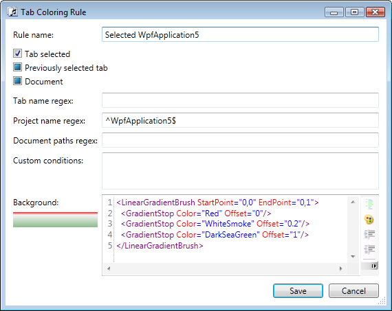 If you use custom colors for your tabs, for example, different colors for tabs from different projects, what do you do with the selected tab from a particular project? In the simplest setup you create a project coloring rule that excludes the selected tab and the selected tab looks the same no matter which project it belongs to:
