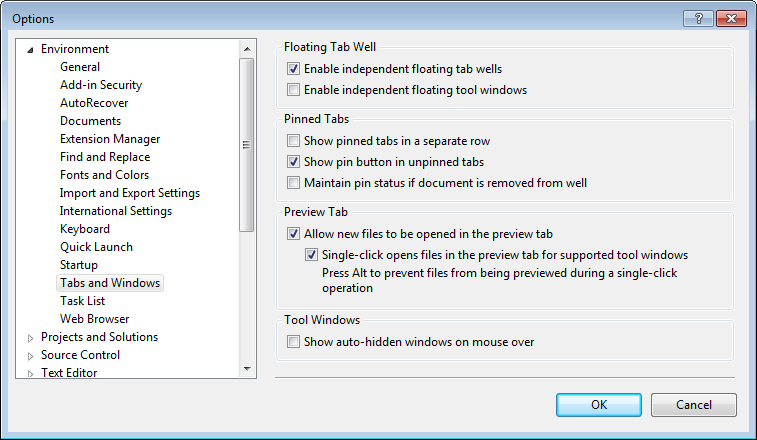 For example, we use TFS, and I always have “Source Control Explorer” open and because I also use your Sorter Add-in, it moves about in the list. I suppose what I’d like is to ‘pin’ a tabs so they stay at the beginning the list and (ideally) aren’t closed when I select the TabsStudio option “Close All Documents”. I know I can duplicate the latter of these with the recent additions to the Marker Add-in, but like all customers, I’m never satisfied! 🙂